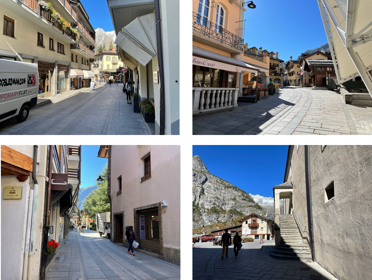 꾸르마요르에 도착해 숙소에서 짐을 풀고 먼저 시내를 구경했다. 눈으로 빼곡히 덮인 알프스 산맥이 바로 눈앞에 펼쳐진 마을이라 꽤나 추울 줄 알았는데 오산이었다. 고도 때문인지 햇빛이 무척이나 뜨거워 이내 촘촘한 건물 사이로 그늘을 찾아다녀야 했다.