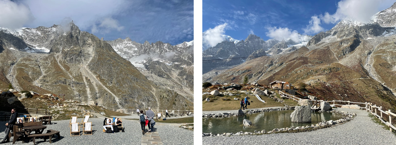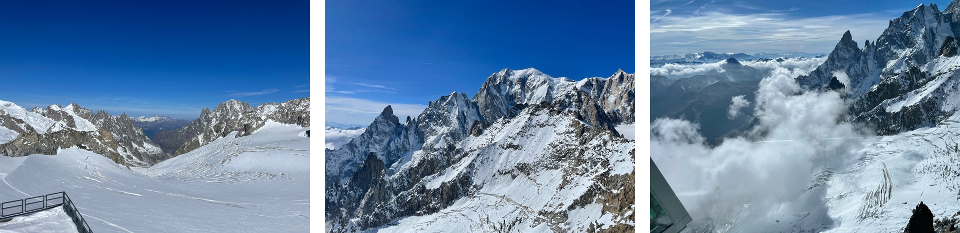 전망대에서는 4,800m 높이의 몽블랑과 더불어 그를 둘러싼 알프스 산맥과 3,000m 아래 산기슭에 자리 잡은 아오스타 밸리를 360도로 구경할 수 있다. 높은 고도로 인해 숨이 가빠지는 와중에도 새하얀 산들과 눈앞에 펼쳐진 구름, 정상과 다르게 푸르기만 한 협곡의 마을을 보니 감탄을 하지 않을 수 없었다.