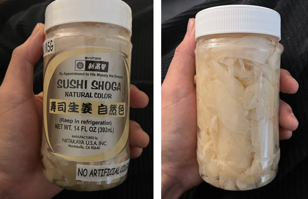 일본어로 생강이 ‘쇼가(Shoga)’라서 제품에는 간단히 ‘쇼가’라는 이름이 붙어 있지만, 정식 명칭은 초생강의 일본어인 ‘가리(Gari)’가 맞겠다. 초생강 가리는 스시집에서 흔히 볼 수 있는 반찬이다. 생강이 강한 생선의 풍미를 중화하는 역할을 하기 때문에 일식집에서는 스시나 사시미 코스 사이사이에 가리를 먹으며 미각을 재정비하는 것이다.
