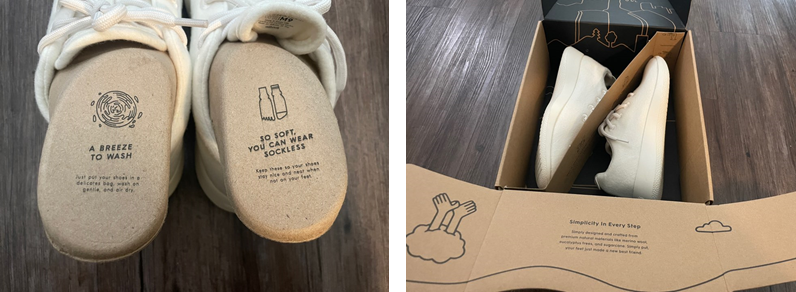올버즈에서 홍보하는 것처럼 환경을 고려한 패키징은 굉장히 심플했다. 일단 신발 박스 안에는 보통 들어있는 각종 포장지 따위가 없었다. 오직 신발 안에 형태를 잡아주는 용도인 슈셰이퍼만 들어 있었다. 그리고 카드보드지로 만든 슈셰이퍼에는 ‘신발을 세탁기에 돌릴 수 있고,’ ‘양말 없이 신을 수 있다’는 올버즈 신발의 특강점이 적혀 있었다.