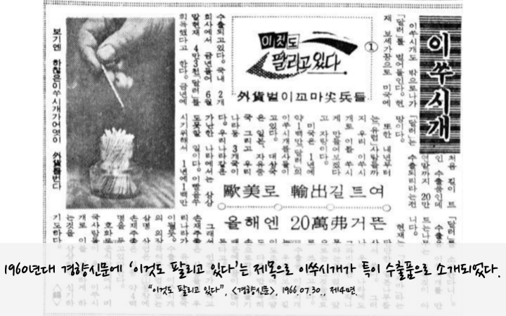 한때 이쑤시개는 우리나라의 큰 자랑이었다. 제1차 경제개발 5개년 계획의 막바지였던 1966년에 경향신문은 ‘이것도 팔리고 있다’는 기획기사를 연재했다. 예상보다 상당히 중요한 역할을 하는 특이 수출품들을 소개하는 재미있는 기사였다. 그 첫 번째 주제가 바로 이쑤시개였다(2편은 다람쥐였다).