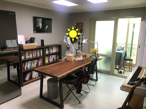 일반적으로 거실은 한 면에 TV를 두고, 반대 면에 소파를 둔다. 그럼 소파가 놓인 면은 등지고, TV가 놓인 면만 사용하는 것이다. 하지만 양쪽에 앉는 테이블을 가운데에 두면 거실의 양면을 같은 비중으로 사용하게 된다. 나는 한쪽 벽에는 책들을 두고, 반대쪽 벽에는 악기들을 두었다. 거실에서 하는 일에 따라 독서를 할 때는 이쪽에, 악기를 연주할 때는 저쪽에 앉기도 한다.