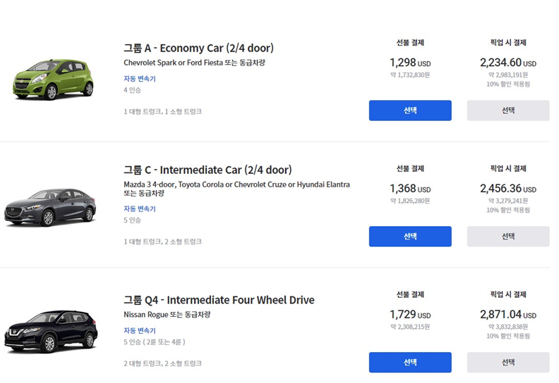 미국에서는 차가 없이는 생활하기가 참 어렵다. 땅은 넓고 대중교통은 그만큼 발전하지 않았기 때문이다. 이를 알고 있었기 때문에 한국에서 출국하기 전, 항공권을 구매하고 숙소를 예약하면서 렌터카도 같이 찾아봤다. 현지에 도착해서 숙소로 이동한 후 천천히 알아보는 것도 방법이겠지만 우리는 미국에 몇 년 간 살 계획으로 온 것이었기 때문에 짐이 너무 많아, 웬만하면 공항에서부터 바로 렌터카를 사용하고 싶었다.