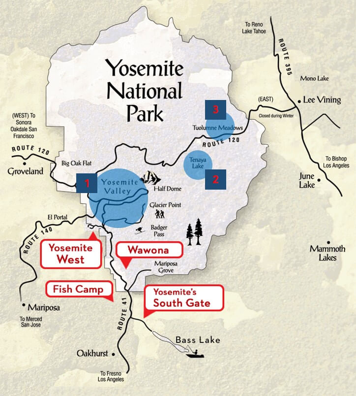 요세미티 내에서 유명한 명소로는 터널뷰(Tunnel View), 하프 돔(Half Dome), 엘 카피탄(El Capitan), 요세미티 폭포(Yosemite Falls)가 있는데 모두 요세미티 밸리 쪽이다. 한마디로 뻔한 관광 명소이자, ‘요세미티’의 대표적인 이미지로 소비되는 경치들인데, 이 명소들을 포인트로 찍으면서 돌아다니는 국립공원 셔틀버스가 있다.